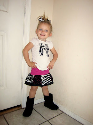 Well, today I was sitting here sorting through my bucket of fabric after realizing Petey's other pair of jeggings was ripped (a pink pair this time) when I saw my zebra and pink polka dot fabric. Then the excitement started...and thirty minutes later, my girly had another new skirt! This pose is killing me! We watched America's Next Top Model last week while at my parents house and today, she whipped out this pose. Scary! I don't think I'll be letting her watch that show with me ever again! Ever!